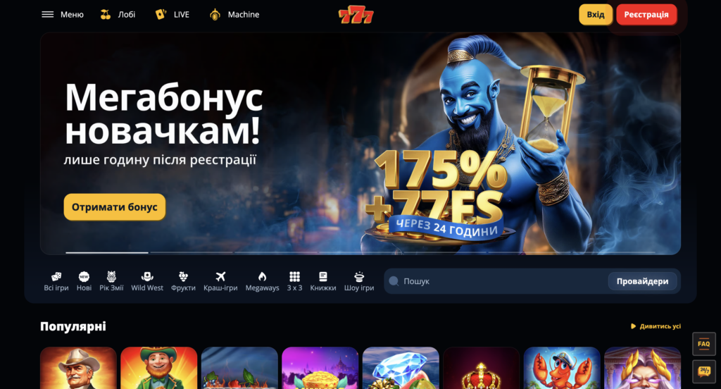 Новачки забирають щедрий Welcome Bonus до 175% депозиту на поповнення від ₴1 500 та 77FS. Аби забрати супербонус, необхідно активувати пропозицію протягом години з моменту створення акаунту. Якщо не встигнути, ставка бонусування зменшиться до 125%.