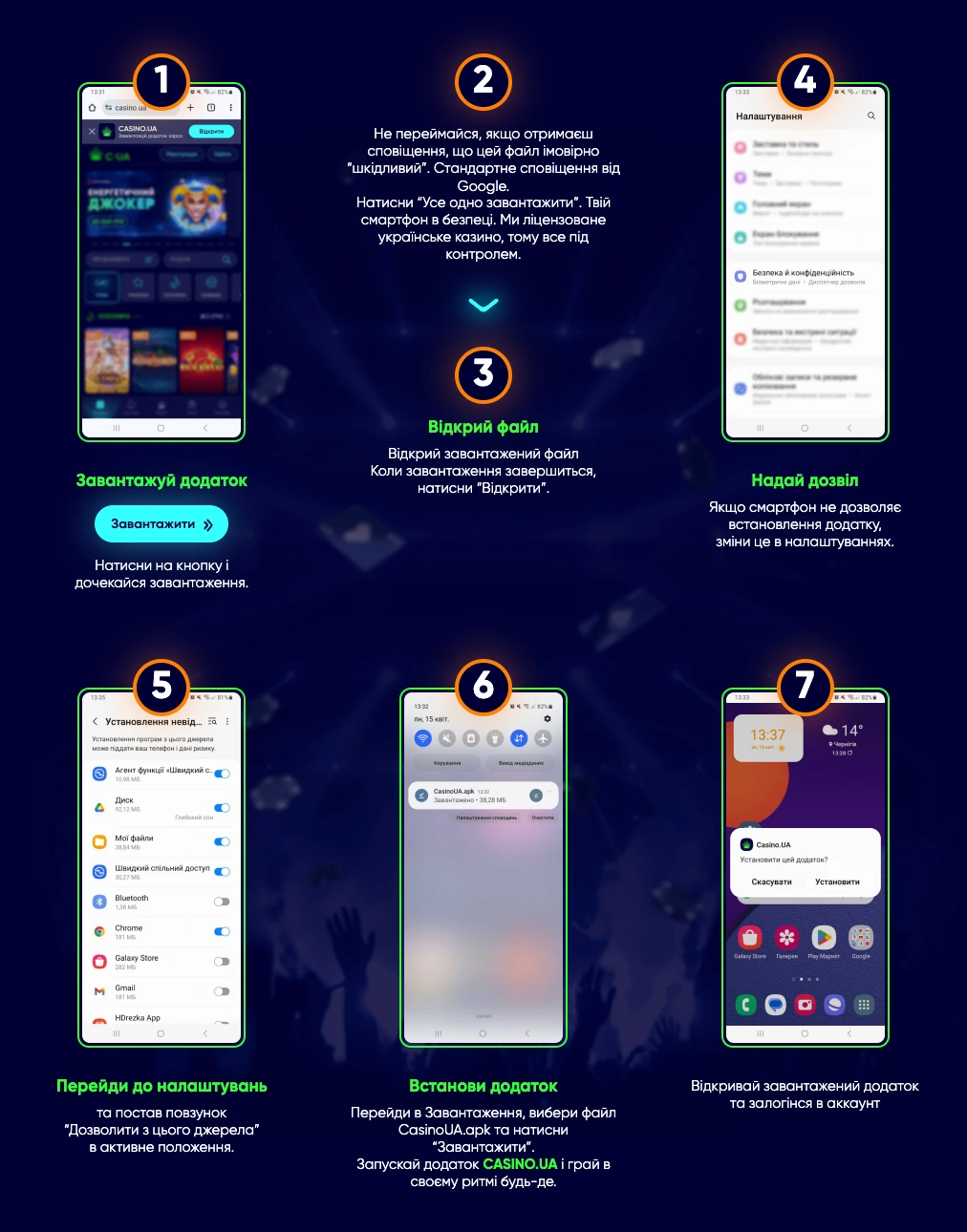 - Скачати застосунок Casino UA на iOS або Android зі сторінки офіційного сайту чи фірмового магазину