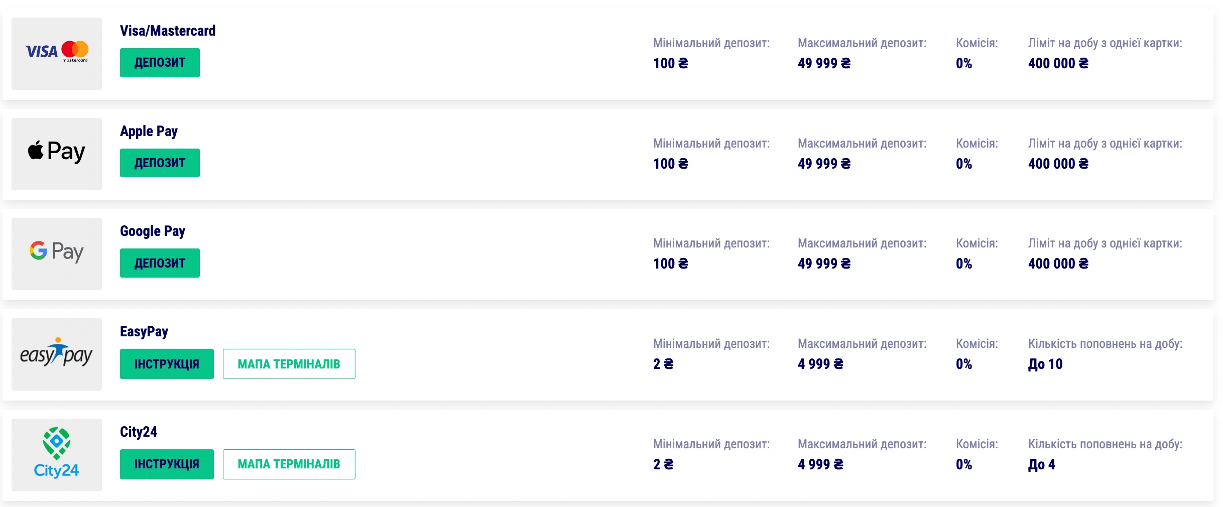 Бонусу за створення профілю немає. Однак активувати винагороду можна відразу після авторизації. Для цього поповніть баланс за допомогою однієї з доступних платіжних систем. Чим більше грошей внесете на рахунок, тим вищою буде бонусна сума.