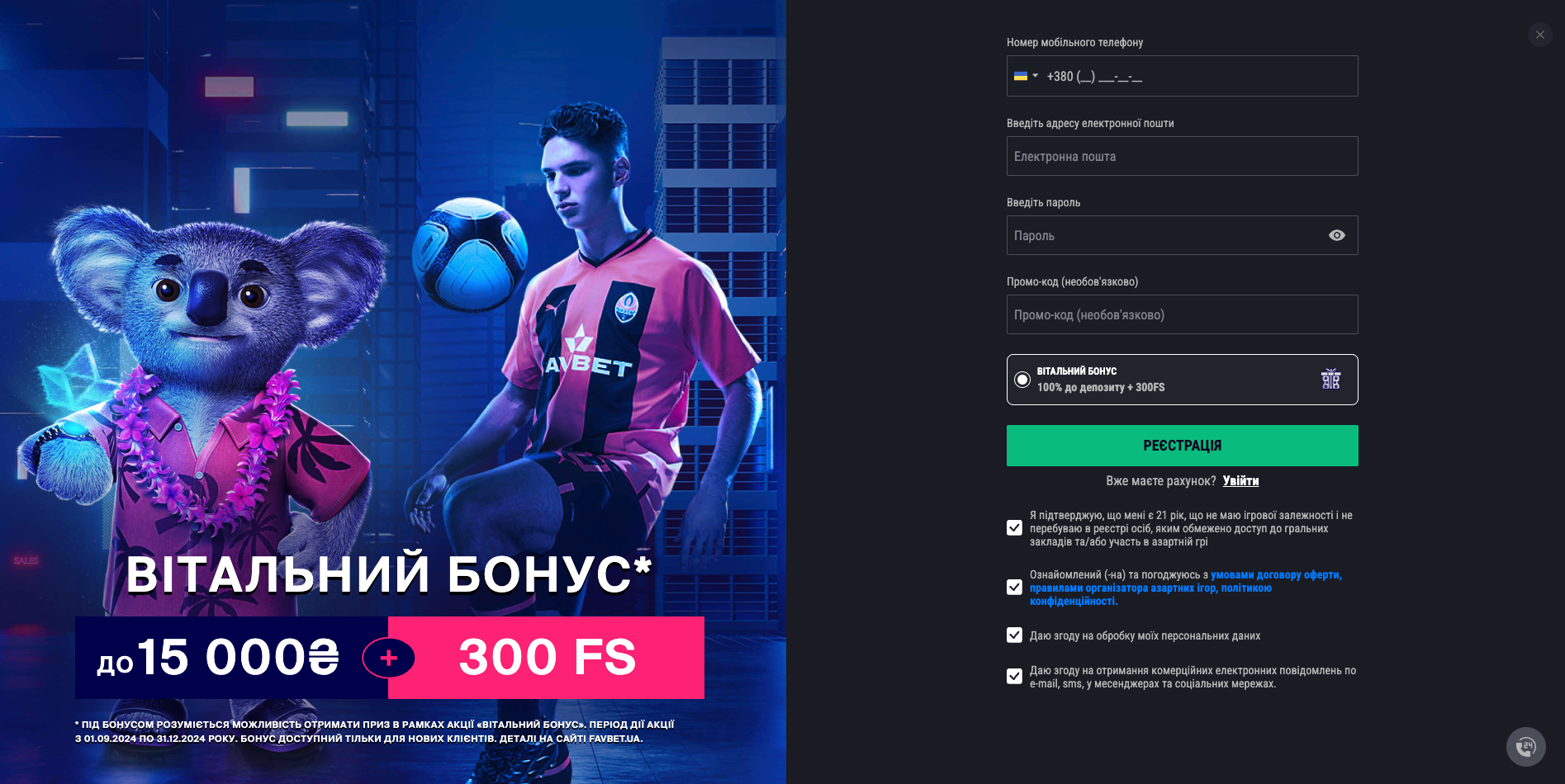 - Введіть бонусний код, якщо є. Це дозволить отримати додаткові заохочення після авторизації.