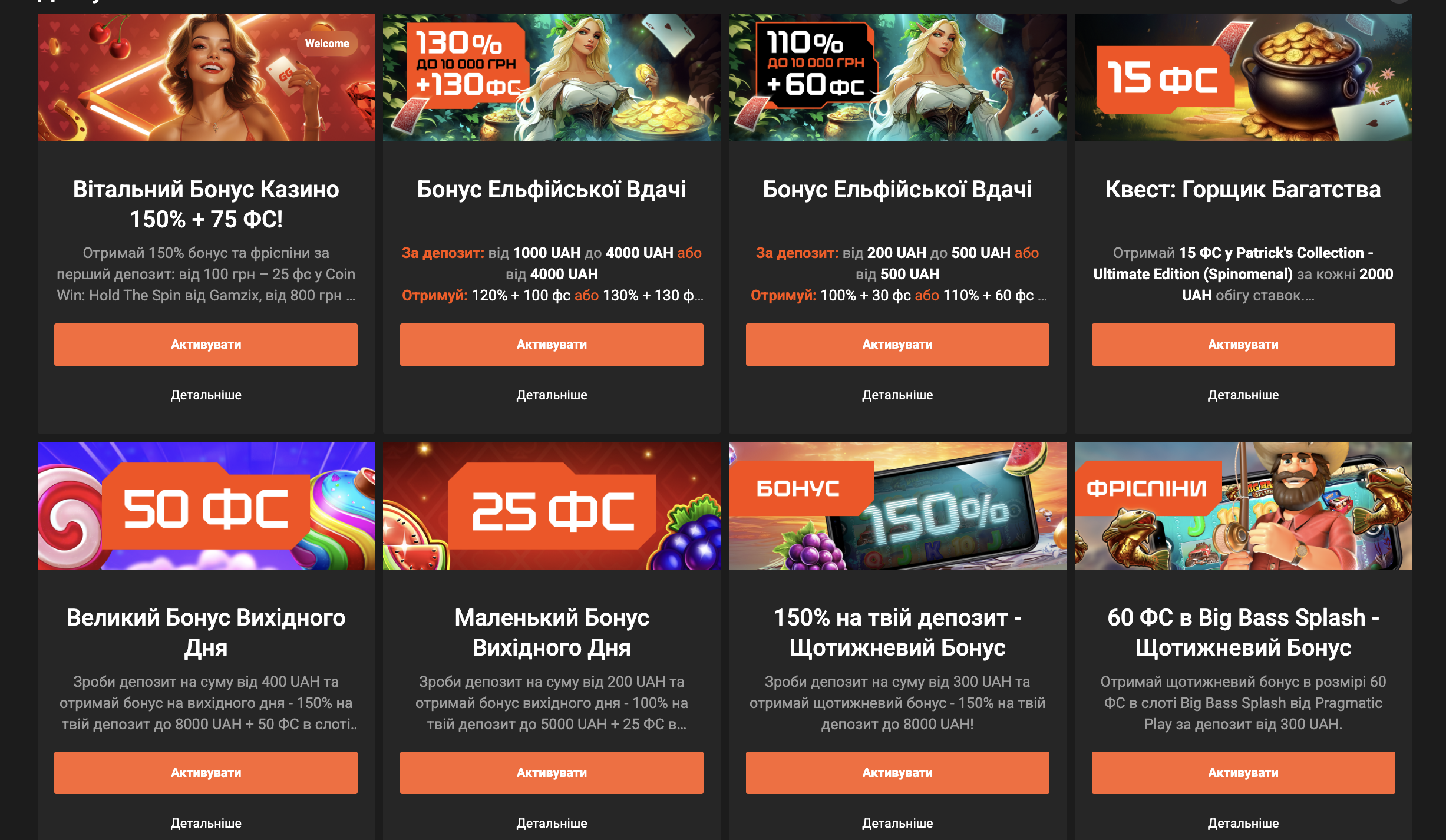 - бонуси та акції – детальна інформація про них, використання та відіграш;