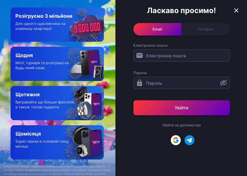 - Функціонал: доступний повний функціонал з іграми, бонусами та іншими можливостями.