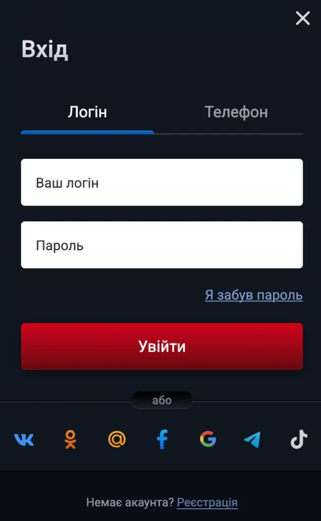 - Клацніть на іконку «Вхід» та введіть свої реєстраційні дані: електронну адресу або номер телефону та пароль.