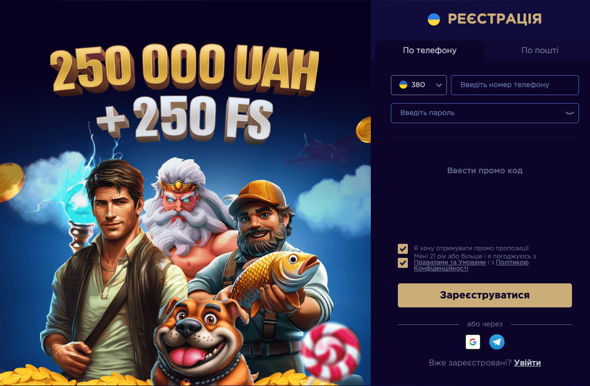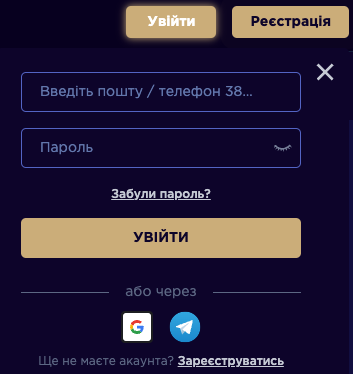 | 🔗 Через акаунт Google або Telegram | Вхід без введення пароля, якщо акаунт був використаний при реєстрації | Миттєво при наявності підключеного акаунту |