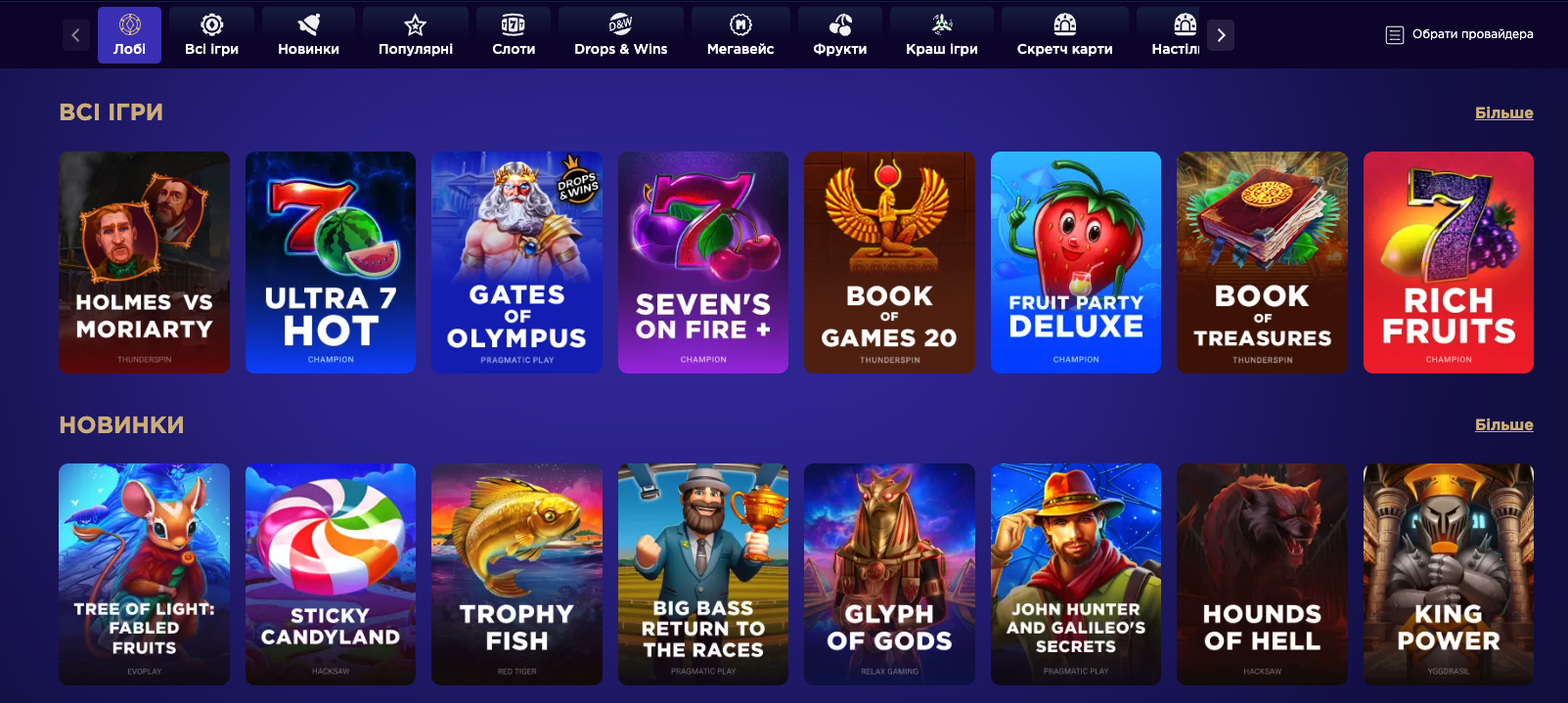 - активація бонусів і промокодів – через вкладку «Бонуси» та спеціальне поле для введення бонусних комбінацій;